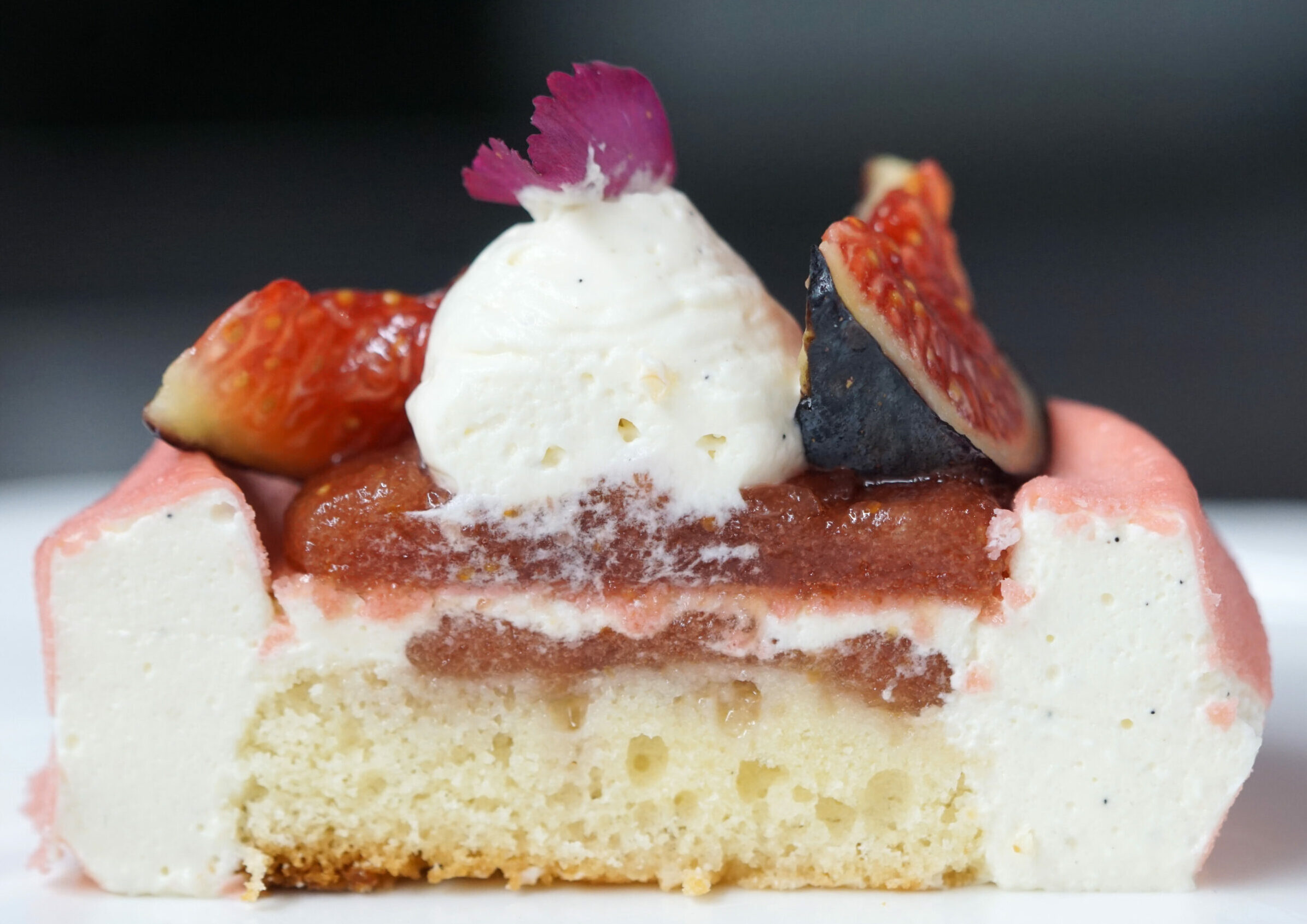 Notre figuier est composé d’un biscuit pain de gêne moelleux et imbibé d’un sirop au vinaigre de framboise,  d’un confit de figue et d’une mousse aérienne à l’eau de fleur d’oranger. Le tout est couronné de figues fraiches et de confit de figue.