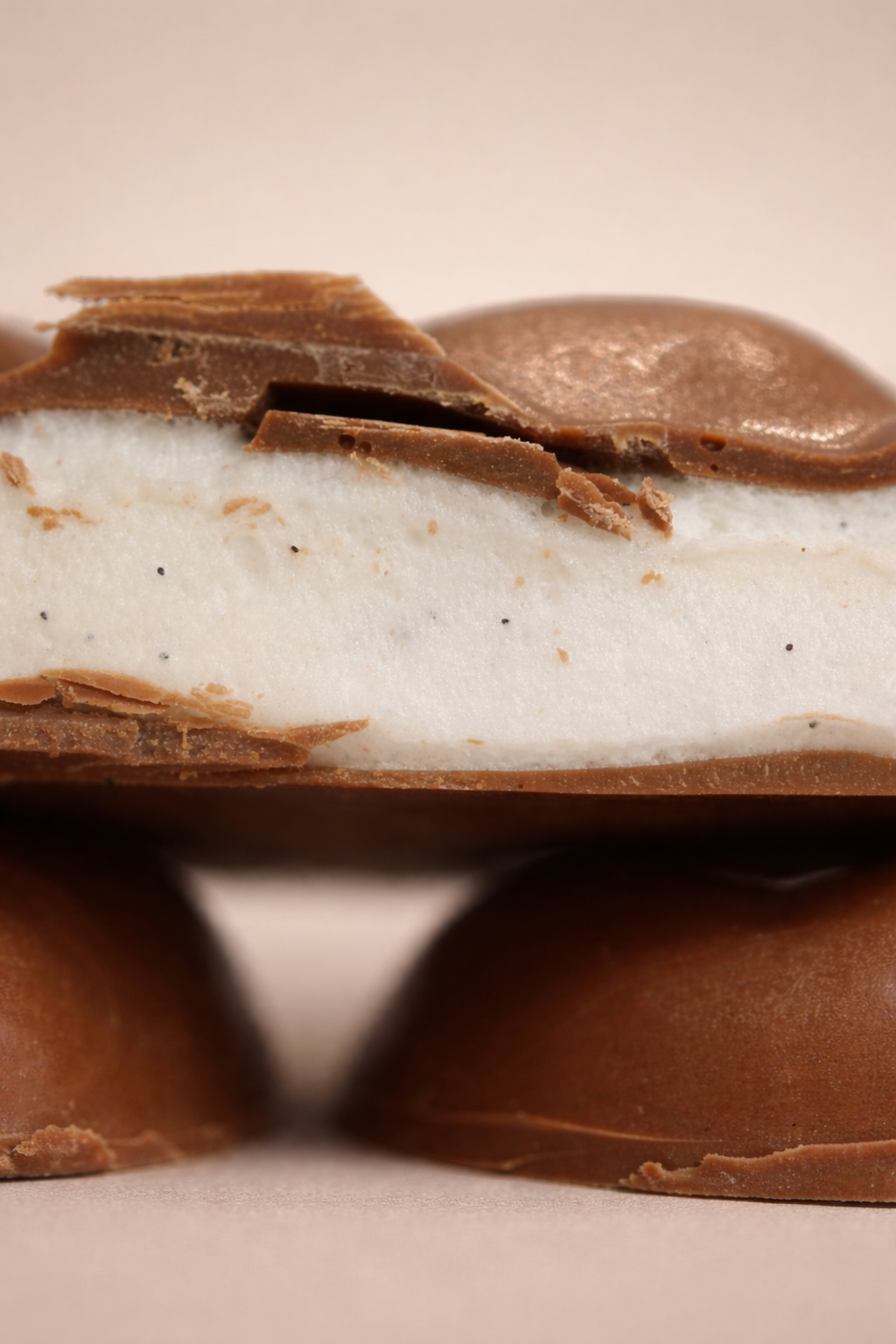 Une texture moelleuse, un goût irrésistible… Chaque bouchée est une explosion de plaisir. Sous une fine couche de chocolat au lait craquant (40% de cacao, origine Pérou) se cache un cœur tendre et fondant de guimauve à la vanille de Madagascar. L’équilibre parfait entre croquant et douceur !